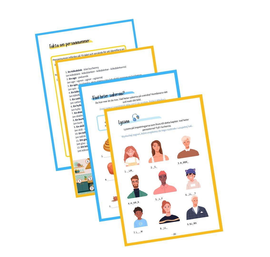 Dzięki różnorodności ćwiczeń w ramach kursu “Snacka svenska!” nie tylko poznasz nowe słownictwo, ale popracujesz też nad wymową, poćwiczysz rozumienie ze słuchu i poznasz ciekawe sposoby na utrwalanie wiedzy zdobytej na lekcjach.